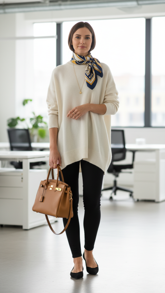 This combination alters basic leggings into a polished outfit that’s both comfortable and professionally appropriate for your workplace.