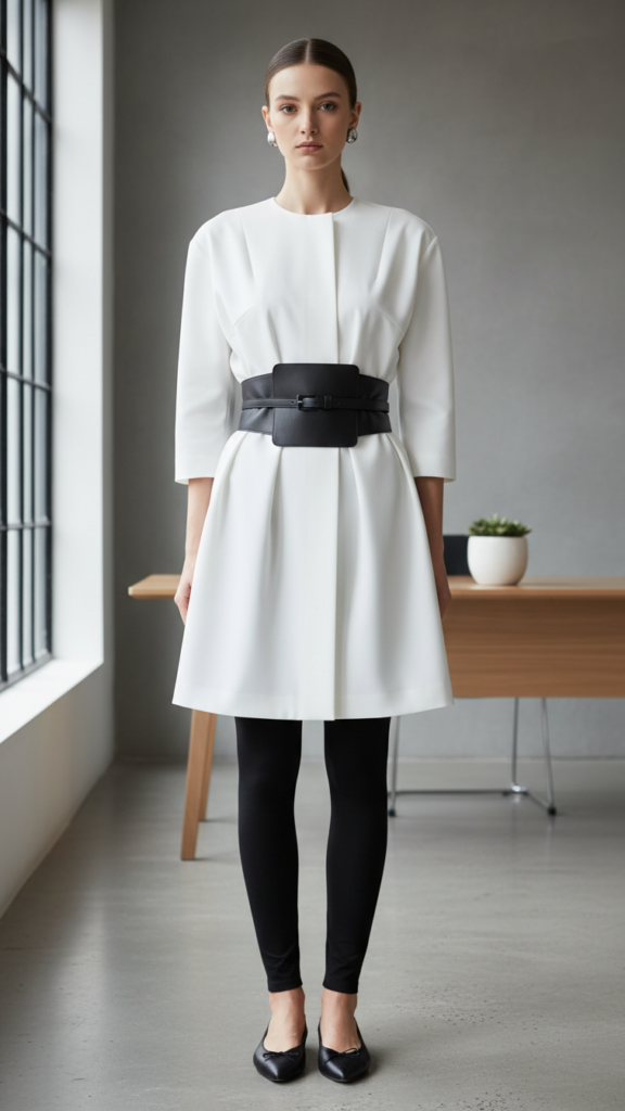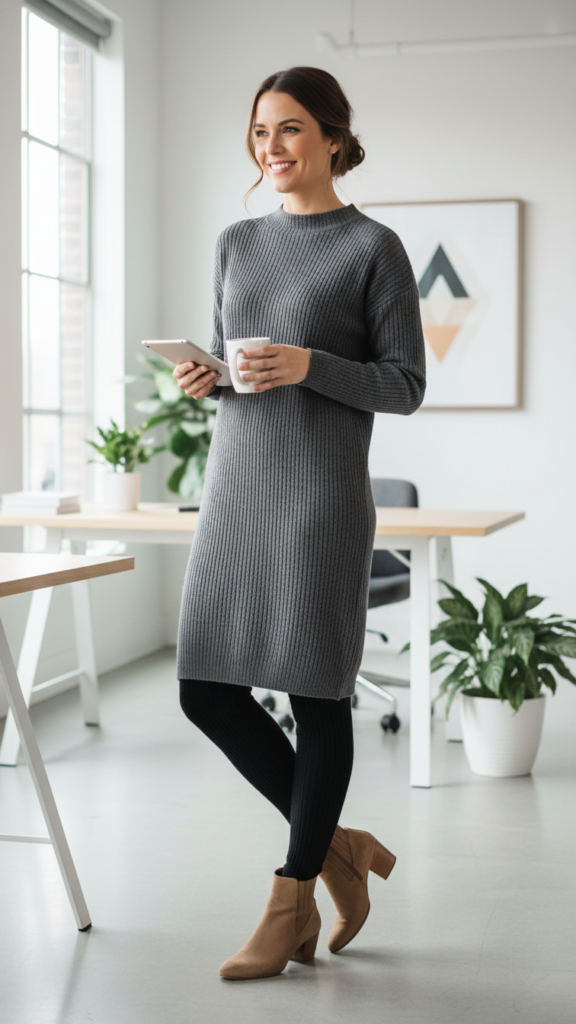 You’ll create an effortlessly polished look by layering these dresses over cozy knit leggings that provide comfort during long workdays. Choose neutral colors like charcoal, navy, or cream for maximum versatility across seasons.