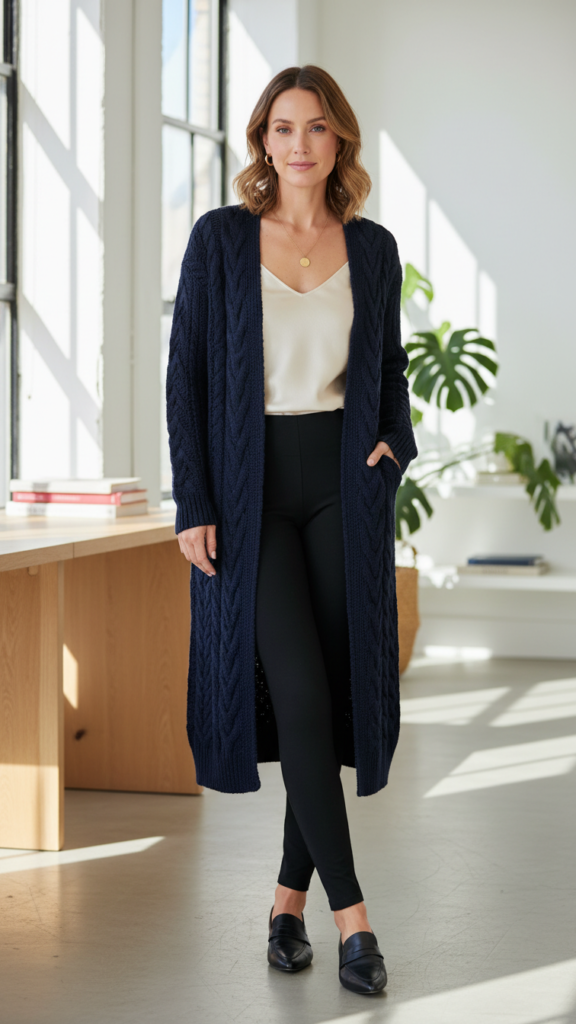 Long cardigans alter your leggings into sophisticated office attire by adding vertical lines that elongate your silhouette while providing professional coverage. You’ll create polished looks by choosing oversized cardigans that hit mid-thigh or longer, giving you the flexibility to move comfortably throughout your workday.