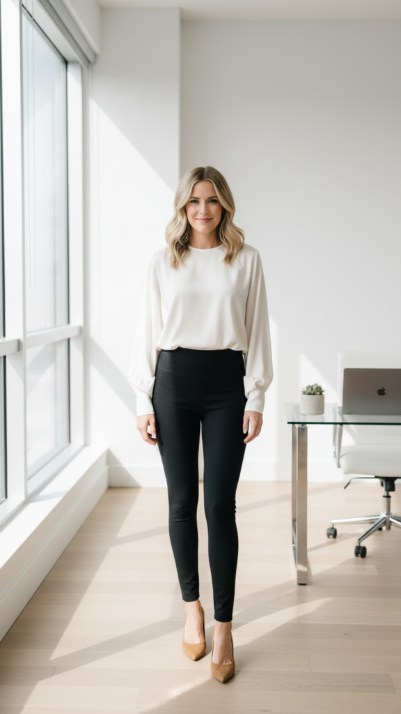 High-waisted leggings paired with a flowy blouse create an effortlessly polished office look that balances comfort with professional sophistication. You’ll achieve maximum impact by tucking your blouse completely into the waistband, creating clean lines that define your silhouette.