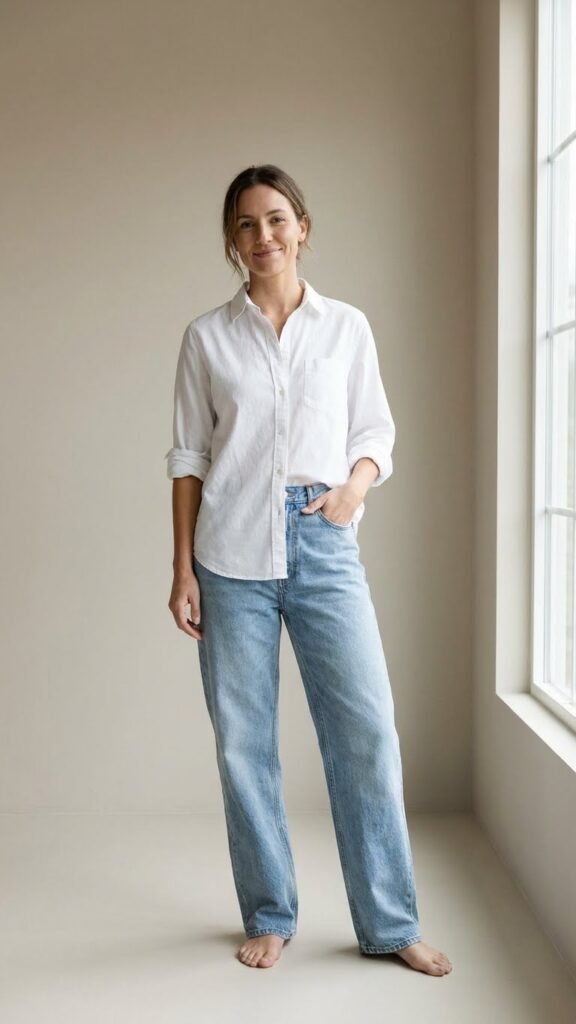 The beauty of this look is in its simplicity. The relaxed fit of the jeans balances perfectly with the fitted tee, creating a silhouette that’s casual but intentional. Throw on some gold hoops and a crossbody bag, and you’re ready for brunch, errands, or whatever your day throws at you. This is the outfit you’ll wear when you want to look put-together but refuse to sacrifice comfort. Because why should you?