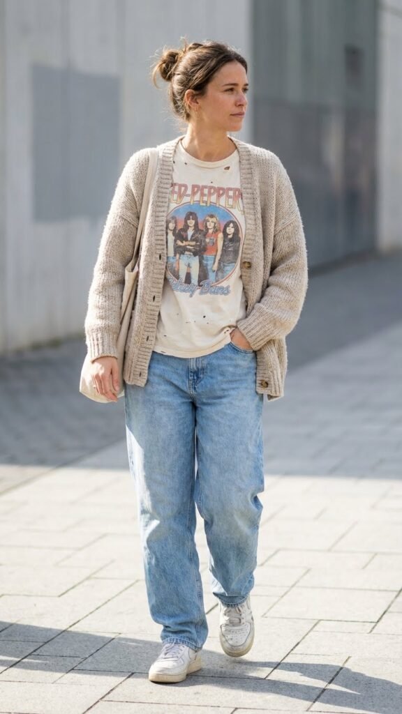 The graphic tee adds personality and prevents the outfit from feeling too basic, while the cardigan provides that cozy layer we all crave. This combination feels young and fresh without trying too hard. The baggy jeans tie it all together and keep the vibe relaxed and approachable. Finish with your favorite sneakers and maybe a baseball cap, and you’ve got the perfect running-around-town outfit.