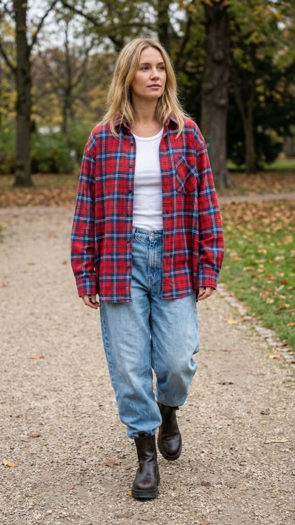 Channel your inner ’90s cool girl with an oversized flannel worn open over a tank top and baggy jeans. This look is peak casual comfort but still looks intentional and stylish.