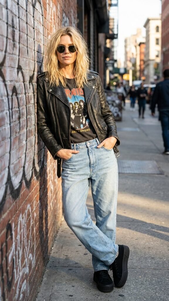 The contrast between the tough leather jacket and the soft, relaxed denim creates visual interest that just works. Whether you go with a classic black moto or a brown bomber style, this combo never misses. Add some combat boots or chunky platform sneakers to lean into the edgy vibe, or soften it with white sneakers if that’s more your speed. Either way, you’ll look like you just stepped out of a street style photo.