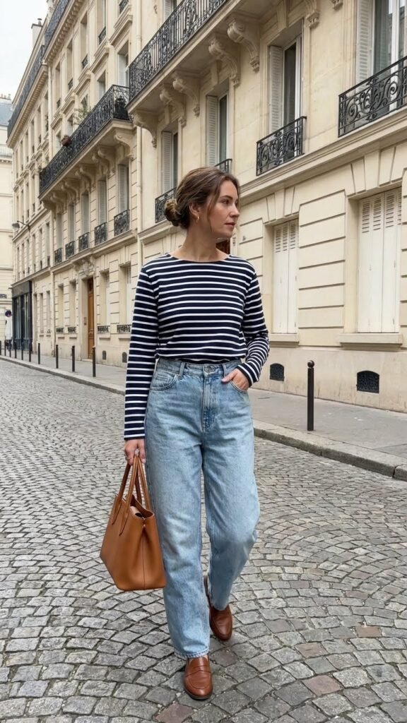 The horizontal stripes add visual interest while the baggy jeans keep things current and comfortable. Loafers elevate the whole situation, making it appropriate for everything from gallery openings to lunch dates. Add a structured tote bag and some delicate jewelry, and you’ve got an outfit that looks expensive regardless of your actual budget. Sometimes it really is the simple things.