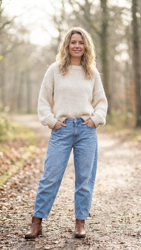 The cropped length of the cardigan is key here because it defines your waist without making the baggy jeans overwhelm your frame. Button it all the way up for a vintage-inspired moment, or leave it open for a more casual feel. Finish with some chunky sneakers or ballet flats, depending on your mood. This outfit screams “effortlessly stylish” and honestly, isn’t that what we’re all aiming for?