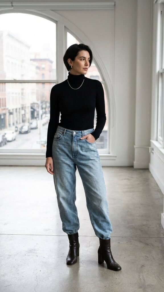 The sleek turtleneck creates a nice contrast with the relaxed denim, and the whole vibe feels put-together without trying too hard. This works for date nights, dinners out, or any time you want to look sophisticated but stay comfortable. Add some heeled boots and statement earrings, and you’re golden. This is the outfit that makes you feel like you’ve got your style figured out.