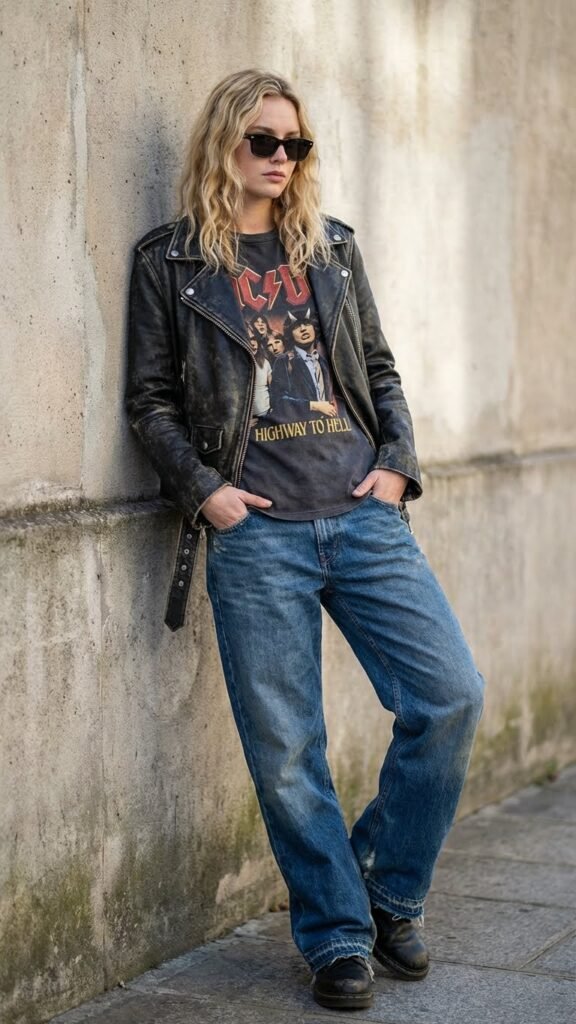 The trick here is to keep everything slightly oversized but not sloppy. Your leather jacket should fit well in the shoulders, and your band tee can be vintage or vintage-inspired—nobody’s checking the receipts. Finish with combat boots or Chelsea boots and maybe a crossbody bag, and you’re ready for concerts, casual dinners, or just walking around looking like you stepped out of a really good music video. This outfit has main character energy written all over it.