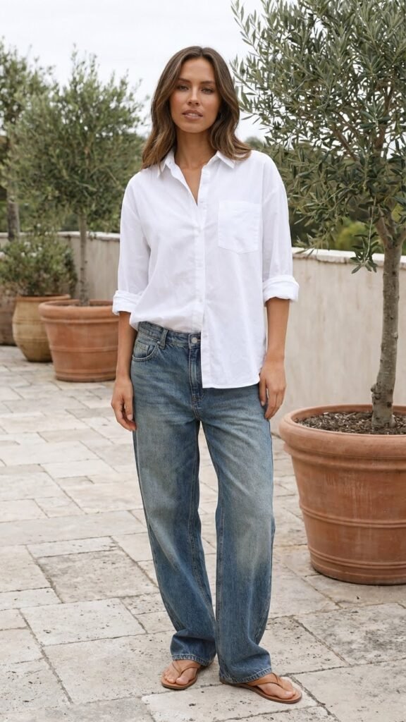 Okay hear me out on this one—the classic white button-down is having a moment with baggy jeans, and it’s giving minimalist chic in the best way. The half-tuck is crucial here because a full tuck can look too stiff, and leaving it completely untucked loses that intentional vibe we’re going for.
