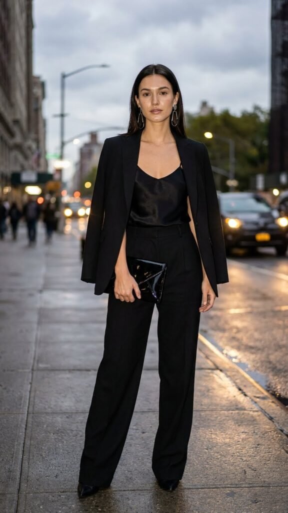 Never underestimate the power of head to toe black. It’s not boring, it’s iconic. Think sleek black trousers, a black satin camisole, and a perfectly tailored blazer draped over your shoulders. This look says “I have my life together” even if you absolutely do not.