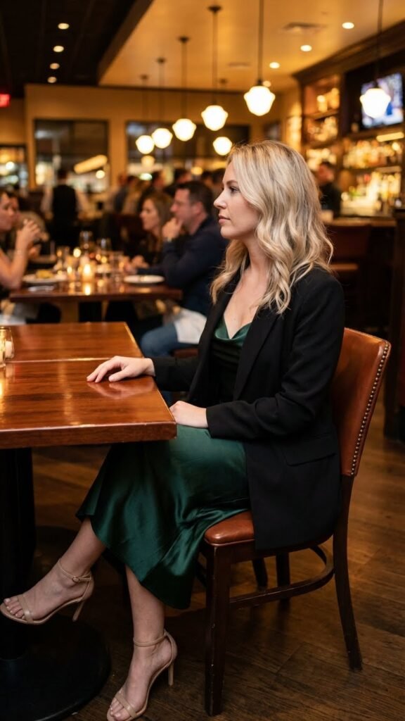 Slip dresses had their moment in the 90s and honestly? They never left. A satin slip dress in a jewel tone like emerald, burgundy, or sapphire is dinner outfit gold. But here’s where it gets interesting: layer a structured blazer over it or add a luxe faux fur stole for instant drama.