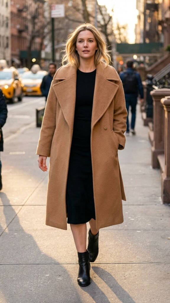Go for a double breasted style in black, navy, or camel for that boardroom meets bar energy. Style with knee high boots or strappy heels depending on the vibe you’re going for. This outfit screams “I make important decisions” and honestly, even if those decisions are just what to order for dessert, own it.
