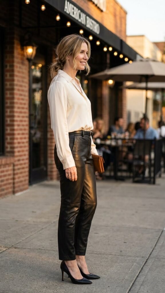 Leather pants at dinner might sound a little rock and roll, but styled right, they’re actually incredibly sophisticated. Pair high waisted leather trousers with a flowy silk blouse in a soft color like blush or cream. The contrast between edgy and feminine is what makes this look feel special.