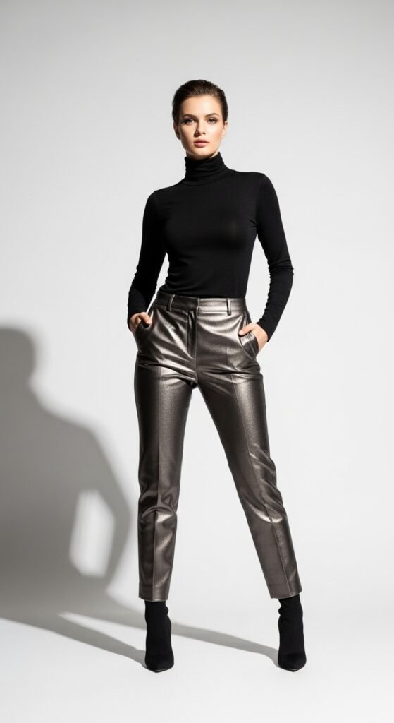 If sleek and sophisticated is more your speed, this one’s for you. A fitted black turtleneck paired with metallic trousers is giving futuristic minimalism in the best way. The turtleneck keeps things streamlined and polished, while the metallic pants add just enough edge to keep the outfit from feeling boring.