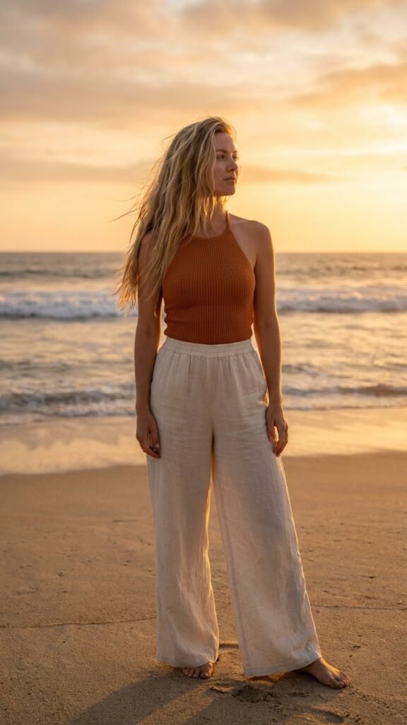 The trick is finding high-waisted linen pants that fit well without being too tight because nobody wants to deal with uncomfortable waistbands on vacation. Now comes the fun part: top them with a vibrant crop top in hot pink, electric blue, or sunset orange. The color pop against crisp white is chef’s kiss.