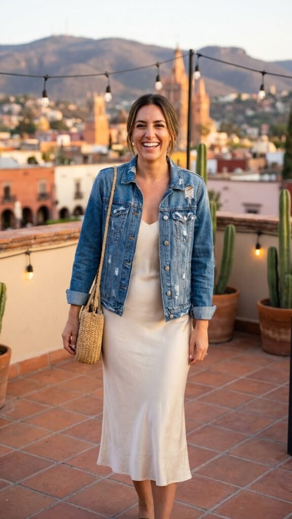 Choose a slip dress in a rich color like emerald green, deep burgundy, or classic black. The fabric drapes beautifully and moves with you, which is perfect for dinner and drinks. Then throw on a light wash or vintage-style denim jacket over your shoulders.