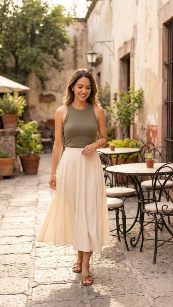 This combination is incredibly versatile. Dress it down with flat sandals for daytime exploring, or dress it up with wedges and statement jewelry for evening plans. The midi length protects your legs from too much sun while still feeling summery and fresh. I wore a version of this to a cooking class in Puerto Vallarta, and it was perfect because I could move freely without worrying about my outfit.