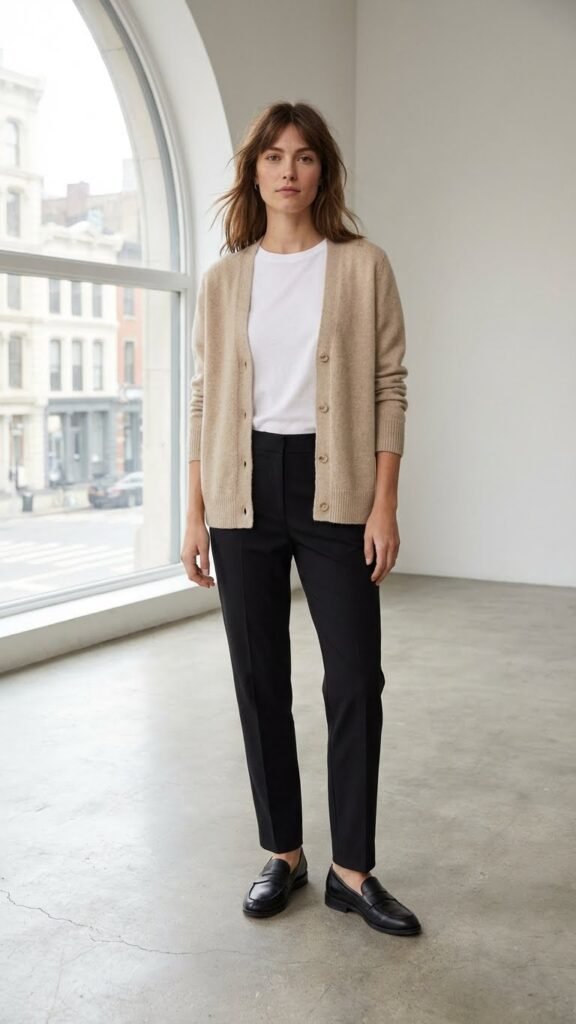 Leave the cardigan unbuttoned for that easy, breezy look. This combo screams “I’m approachable AND put-together,” which honestly is the vibe we’re all going for, right?