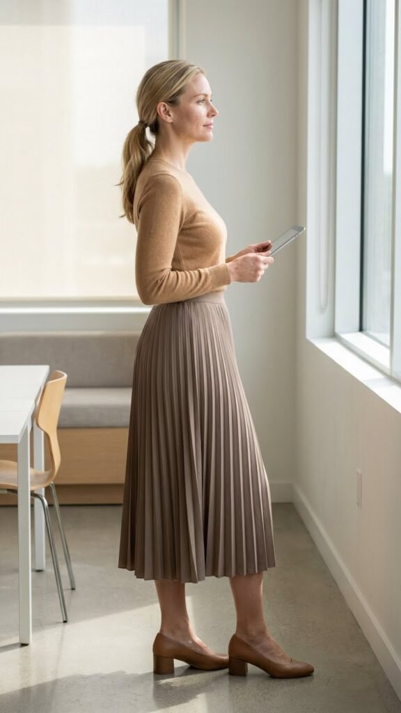Pleated skirts have this magical ability to look expensive regardless of where you bought them. Pair one in a neutral shade with a fitted sweater tucked in, and you’ve got an outfit that feels refined without being stuffy.