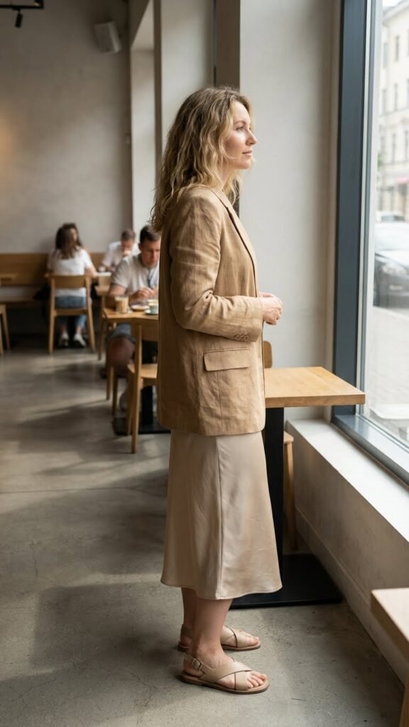 For warmer offices (or those random heat waves that make dressing impossible), a lightweight linen blazer over a slip skirt feels fresh and modern. The contrast between structured and fluid creates that interesting tension minimalist fashion does so well.