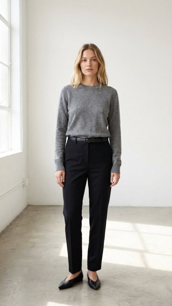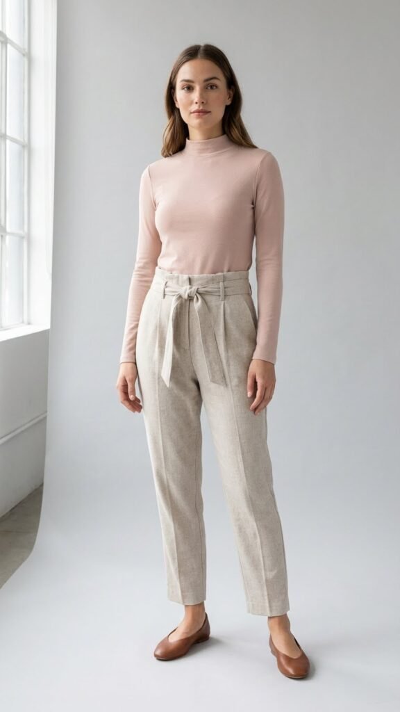 Tuck the top in to showcase that waist detail and keep everything looking intentional. This outfit works beautifully in softer neutrals like oatmeal, dove gray, or blush—proof that minimalism definitely doesn’t mean boring.