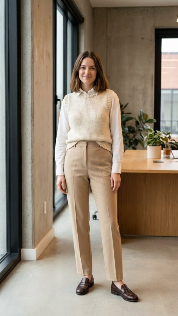This look screams “I read design blogs” in the best possible way. Stick to complementary neutrals—like a cream vest over a white shirt—and you’re golden.