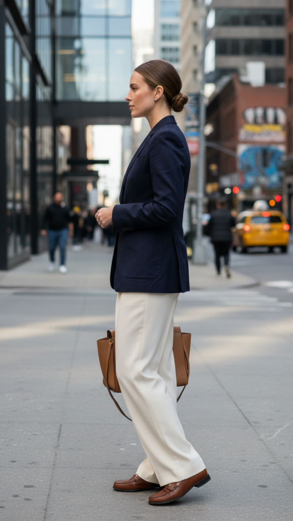Opt for customized fits in classic colors like navy, black, or burgundy, and complete the look with low heels and minimal jewelry for effortless elegance.