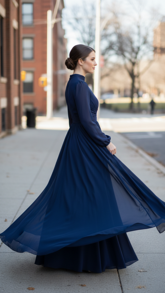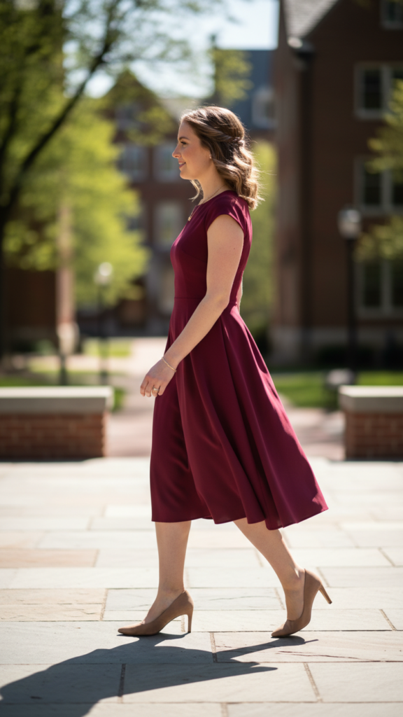 A fit-and-flare dress with a crew neckline offers the perfect balance of feminine charm and academic sophistication for your graduation day. This silhouette flatters virtually every body type while maintaining the modest coverage you’re seeking.