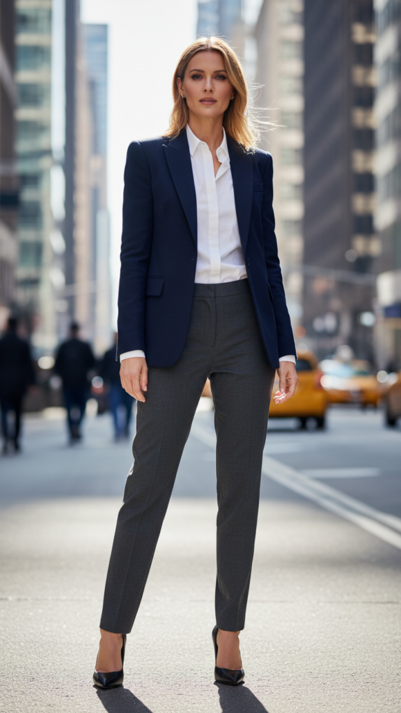 Choose well-fitted pieces in complementary colors like navy blazer with charcoal trousers or matching sets for maximum versatility. This combination offers timeless elegance that moves smoothly from morning meetings to evening networking events.