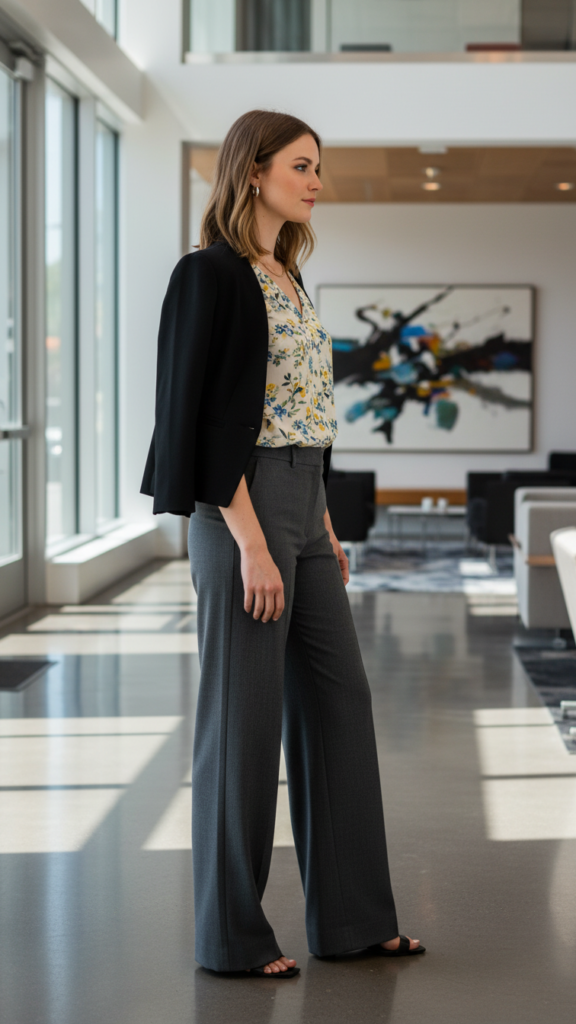 Choose a floral print sleeveless blouse for subtle personality, then pair it with tailored trousers featuring a wide leg silhouette for modern sophistication. The cropped jacket adds structure while maintaining comfort during meetings.