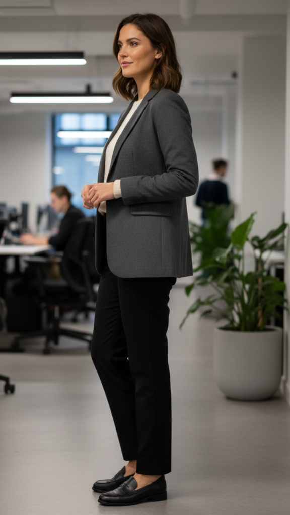 Choose sweater blazers with cozy knit accents like ribbed cuffs or textured weaves that add visual interest without sacrificing structure. The relaxed wide leg fit creates an elongated silhouette that’s both flattering and comfortable for long hours at your desk.