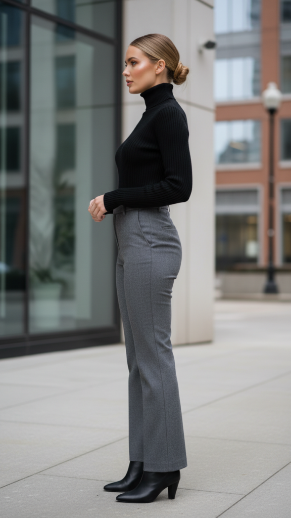 Beyond flowing dresses, turtlenecks paired with high-waisted trousers create a sleek foundation that works across seasons and office environments. This combination gives you instant sophistication while maintaining comfort throughout your workday.