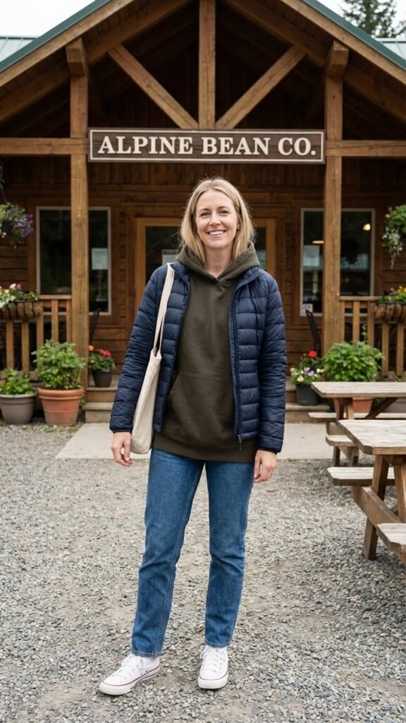 Finish with white sneakers or low-profile boots. This outfit screams “effortless mountain casual” and works for pretty much any daytime activity. Coffee run? Check. Scenic drive? Check. Light hiking? You’re covered.