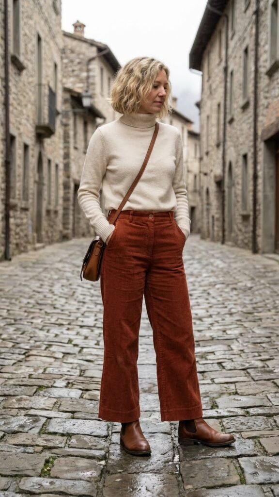 Let’s talk texture. This outfit is all about mixing fabrics that feel as good as they look. A fitted or slightly oversized turtleneck in merino wool or cashmere (if you’re feeling fancy) pairs beautifully with corduroy pants. The ribbed texture of both pieces creates visual interest without being too matchy-matchy.