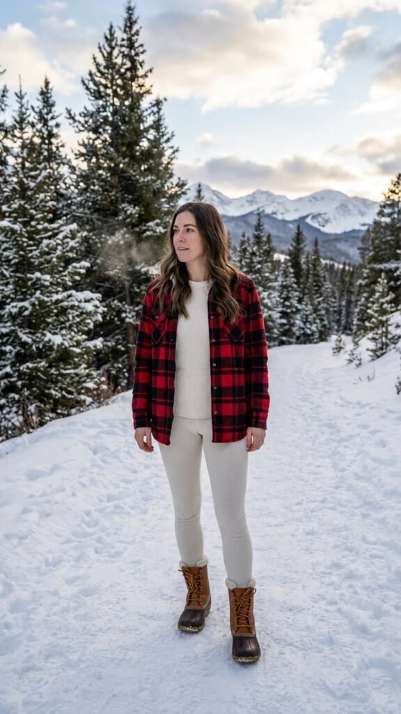 When it’s really cold, you need to start with a solid foundation. A matching base layer set (thermal top and bottoms) might not sound exciting, but trust me, it changes everything. Layer a shacket (shirt-jacket hybrid) over the top, and finish with insulated snow boots.