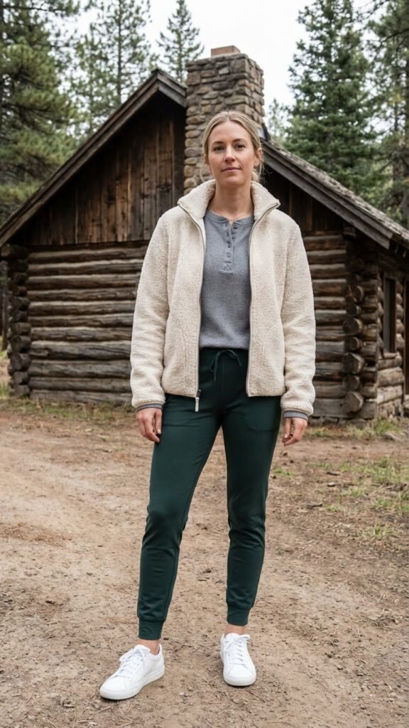 Keep your shoes simple with clean sneakers or slip-on shoes. Add a beanie if it’s cold, and you’ve got that “mountain casual chic” thing down. This works for low-key days when you’re mostly hanging around the cabin or doing easy outdoor activities.