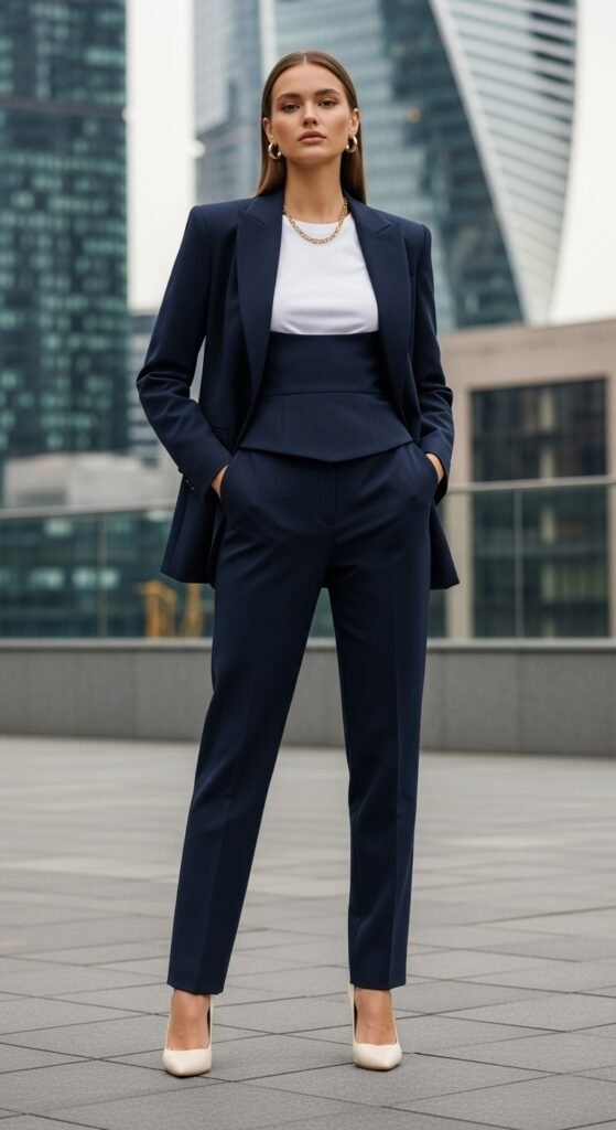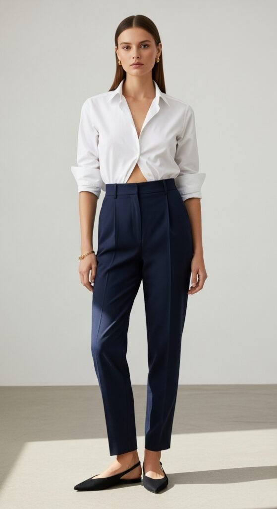 Let’s start with the classic because honestly? It earned its reputation. A white button-down shirt tucked into high-waisted navy trousers is chef’s kiss levels of polished. But here’s the trick nobody tells you. Leave the top two buttons undone and roll your sleeves to the elbow. Suddenly you’re giving “I run things around here” energy instead of “I’m headed to a job interview in 2005.”