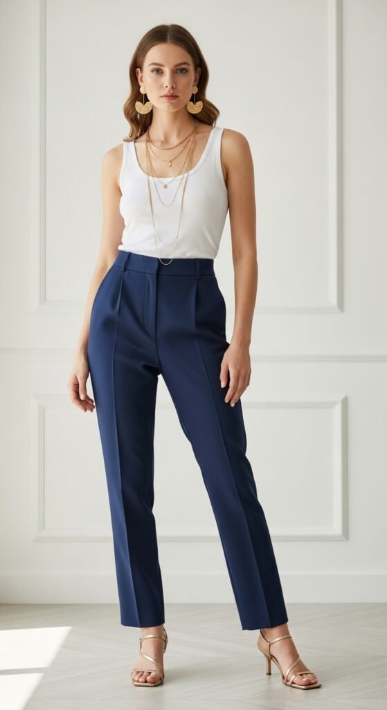 Sometimes less really is more. A simple fitted tank in white, cream, or even light pink with navy trousers creates a clean canvas for amazing accessories. This is when you break out those statement gold earrings, layered necklaces, or that bracelet stack you’ve been building.