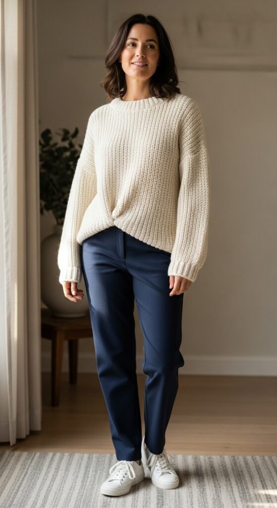 Is it even sweater season if you’re not living in oversized knits? Pair your navy trousers with a chunky cream or oatmeal sweater and watch the compliments roll in. The contrast between the structured pants and the relaxed sweater creates this perfect balance of put-together and approachable.