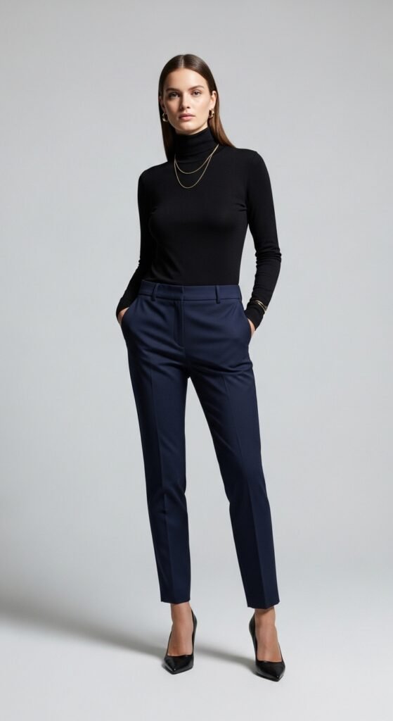 Navy and black together? Absolutely yes. I know some people clutch their pearls at this combination, but honestly, those people are missing out. A fitted black turtleneck with navy trousers looks incredibly sleek and modern. It’s giving minimalist art curator vibes, and I’m here for it.