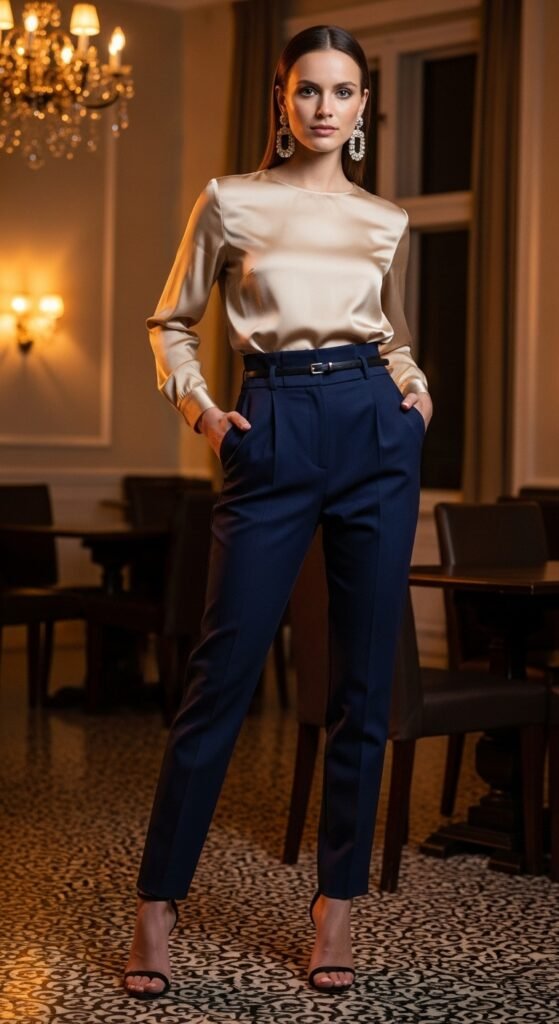 Style tip that changed my life: tuck the blouse in completely and add a thin belt to define your waist. Strappy heels and statement earrings finish the look perfectly. This outfit has saved me countless times when the dress code says “smart casual” and I have no idea what that actually means.