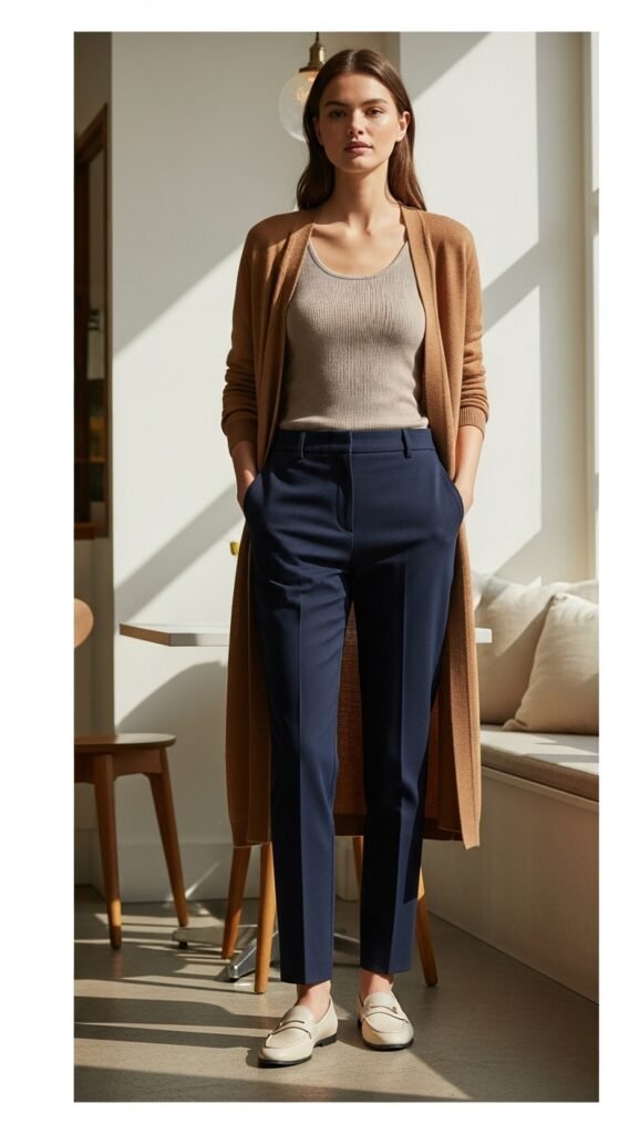 For those in-between weather days when you need layers but not a full coat, reach for a longline cardigan in camel or cream. Worn over a fitted tank or simple tee with your navy trousers, this creates a relaxed but polished look that works for coffee dates, shopping trips, or working from home when you might need to turn the camera on.