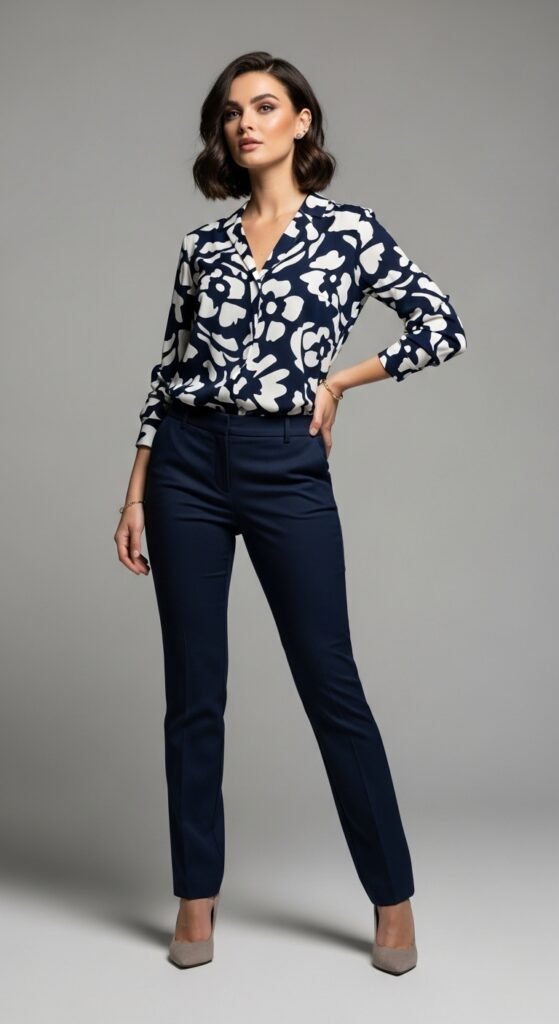 Ready to be a little daring? A bold printed blouse in florals, abstract patterns, or even polka dots pairs beautifully with navy trousers. The dark pants ground the busy print and prevent the outfit from looking overwhelming. It’s the perfect way to add personality without going full clown costume.