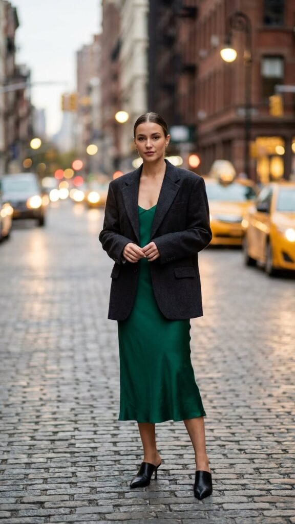 Go for a midi-length slip in a rich jewel tone. Think emerald, burgundy, or sapphire. The blazer should have some shoulder structure to balance out the softness of the dress. Pointed-toe mules complete the look without screaming “I tried too hard.”