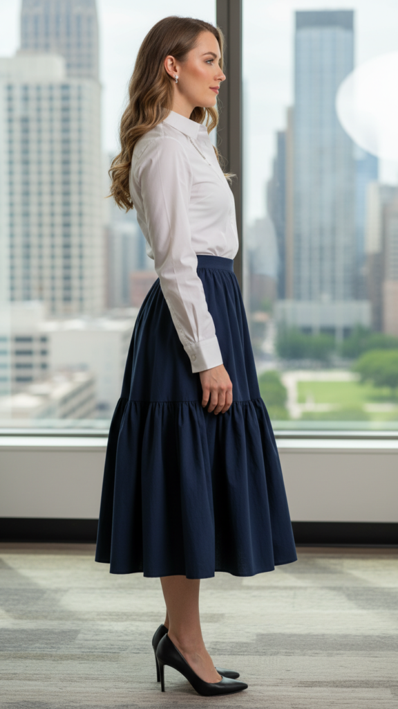 Try a classic white button-down with a ruffled midi skirt in navy or burgundy for sophisticated texture. Alternatively, enhance your look with a peplum button down tucked into fitted trousers or a pencil skirt. This combination allows you to express individual style through bold prints, rich colors, or unique silhouettes on the bottom while keeping your top polished and professional for any corporate gathering.