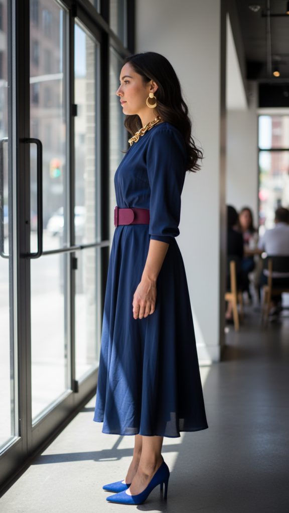Choose accessories from a bold color palette—emerald green scarves, burgundy belts, or cobalt blue shoes add personality without overwhelming your look. Structured blazers, sleek heels, and a polished handbag complete the ensemble, giving you confidence to network and present with authority. These chic office outfits ensure you look polished and stylish while making a professional impression at any workplace event.