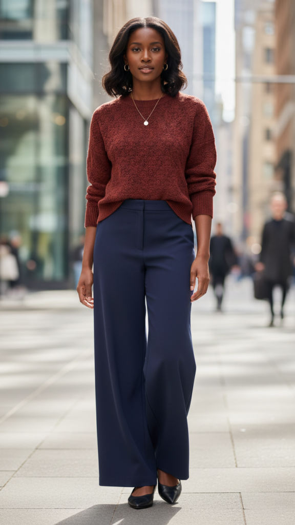 Choose a structured knit sweater in rich colors like burgundy or navy to enhance the casual fabric. Wide-leg trousers in complementary tones create visual balance while offering breathable comfort. These tailored pants form the foundation of versatile everyday workwear that transitions seamlessly from desk to event. Complete this ensemble with stylish accessories: pointed-toe flats, a structured handbag, and delicate jewelry that won’t overwhelm the clean lines of your outfit.