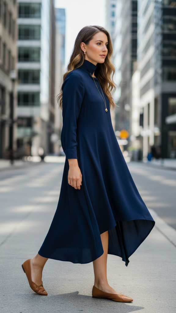 The effortless silhouette works beautifully when you choose modern details like asymmetrical hemlines, subtle cutouts, or unexpected fabric combinations. This soft and stylish approach creates a modern charm that perfectly balances professionalism with contemporary appeal.