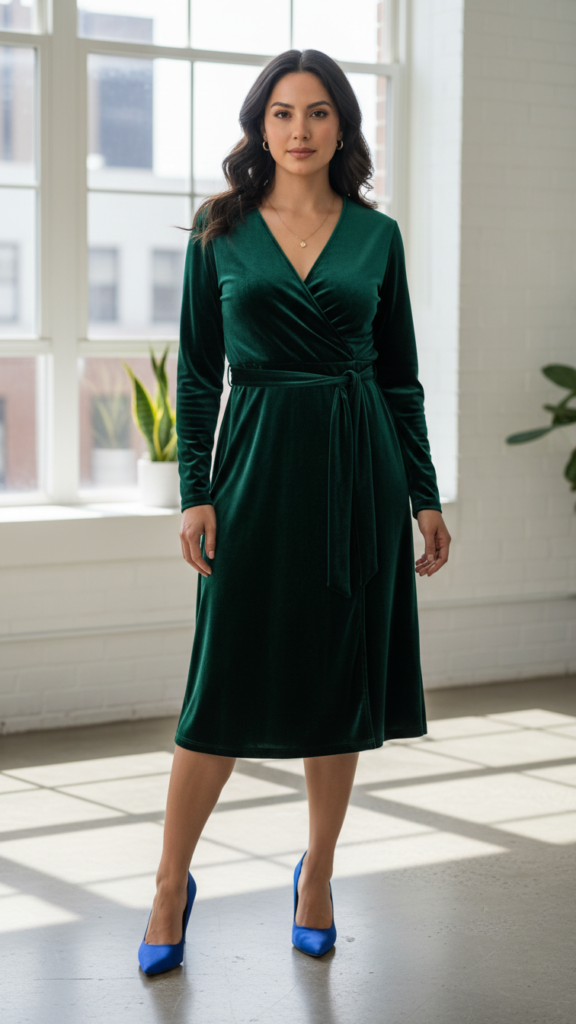 Consider a plush velvet wrap dress in deep jewel tones for evening networking events or holiday parties. Pair it with pointed-toe pumps and delicate jewelry for polished sophistication.