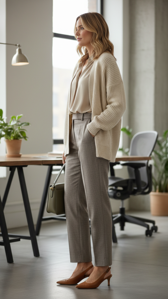 When you’re building a versatile office event outfit, combining a textured cardigan with straight-leg pants creates a refined look that moves effortlessly from meetings to after-work gatherings. Choose cardigans with subtle cable knits or ribbed patterns that add visual interest without overwhelming your professional appearance.